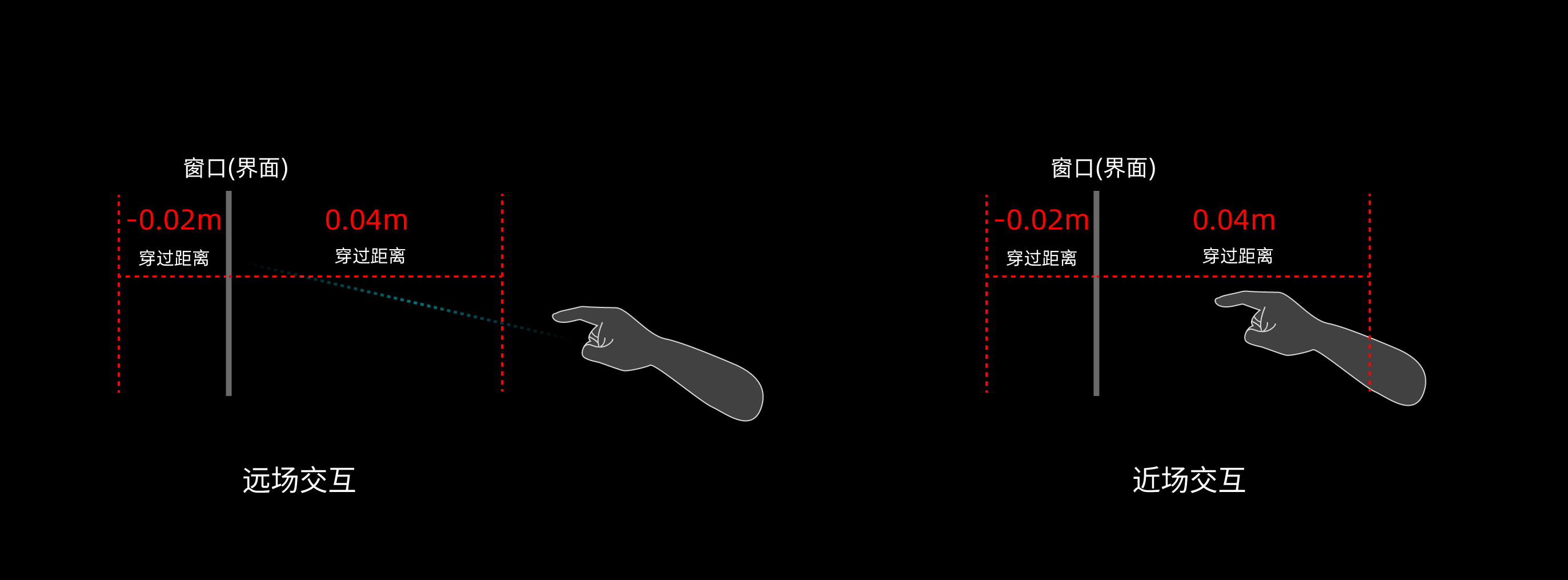 Rokid将手势分为近场手势和远场手势:直接进行触碰互动的,称为近场手势;通过射线和锚点远距离操控的,是远场手势。近场手势和远场手势的切换,是通过手与互动物体的距离判定,这个值可以根据具体使用场景调节。默认设置是,手在距离互动物体 -0.02m ~ 0.04 m 范围内,是近场手势;超出则为远场。