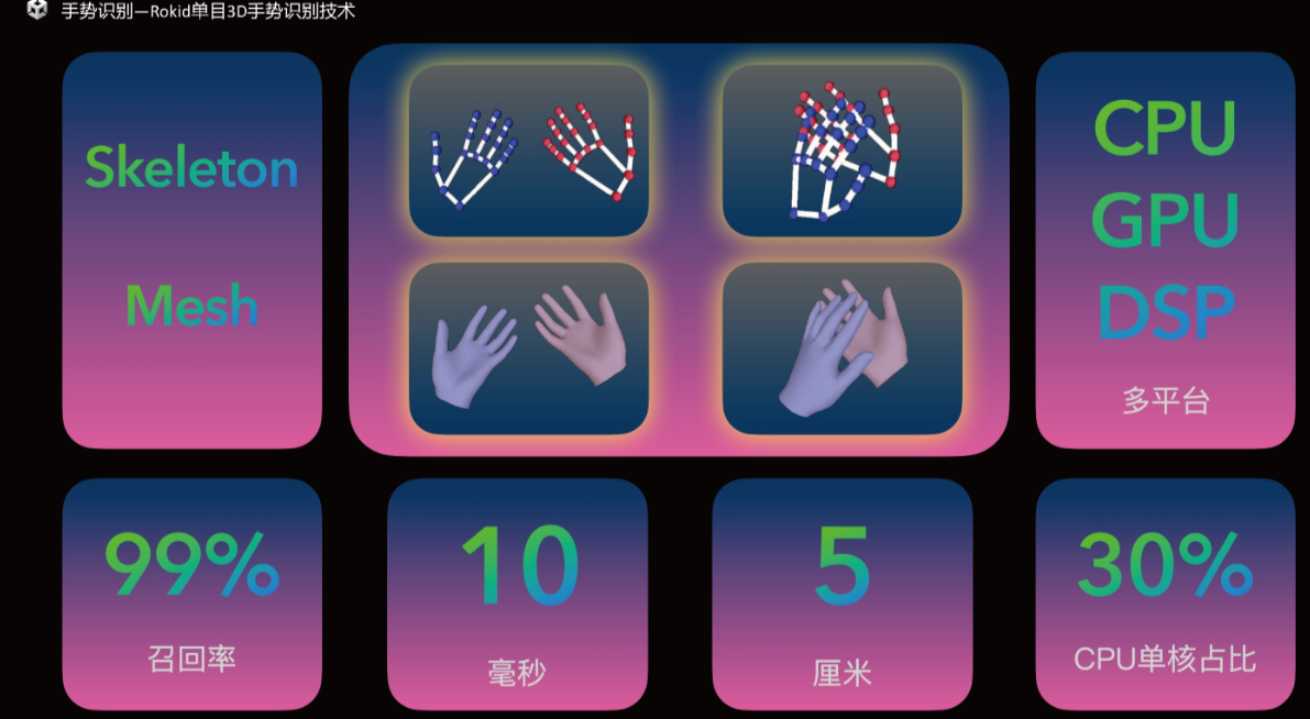 - 利用 AI 算法和深度学习模型,Rokid的“AR专属眼睛” 能实时捕捉手部的 3D 姿态信息,包括手部的 6DoF(六自由度)位置、26 个关节点的自由度(26DoF)以及 Hand Mesh(手部网格)信息。