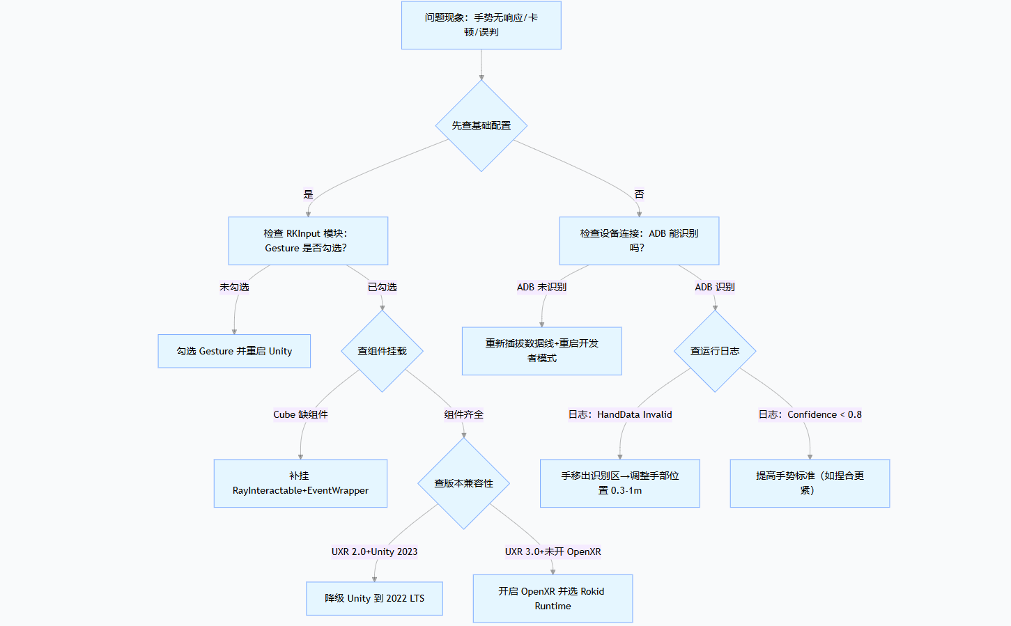 | 现象 | 1. 手部未进入识别区;2. 灵敏度太低;3. 事件未绑定 | 1. 手放在相机前方 0.3-1m,掌心朝设备; 2. 脚本中 dragSensitivity 设为 0.15;3. 检查 EventWrapper 的事件是否绑定(WhenSelect 等) |