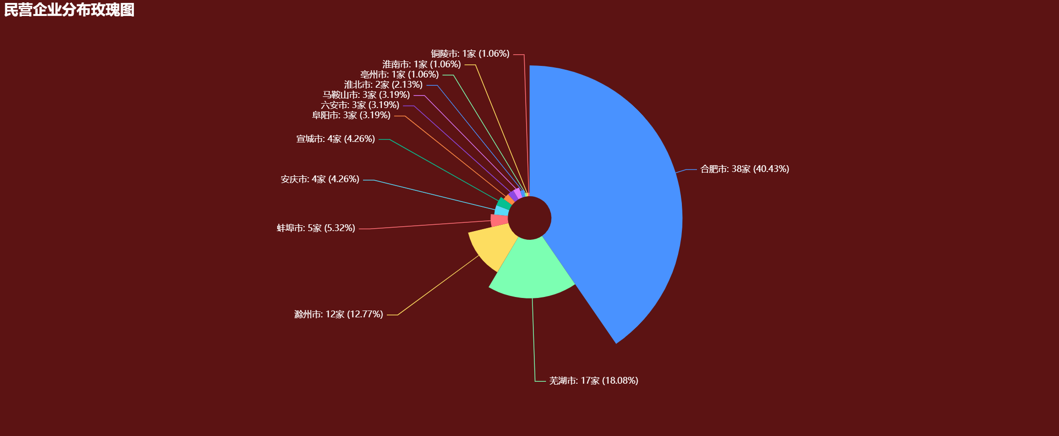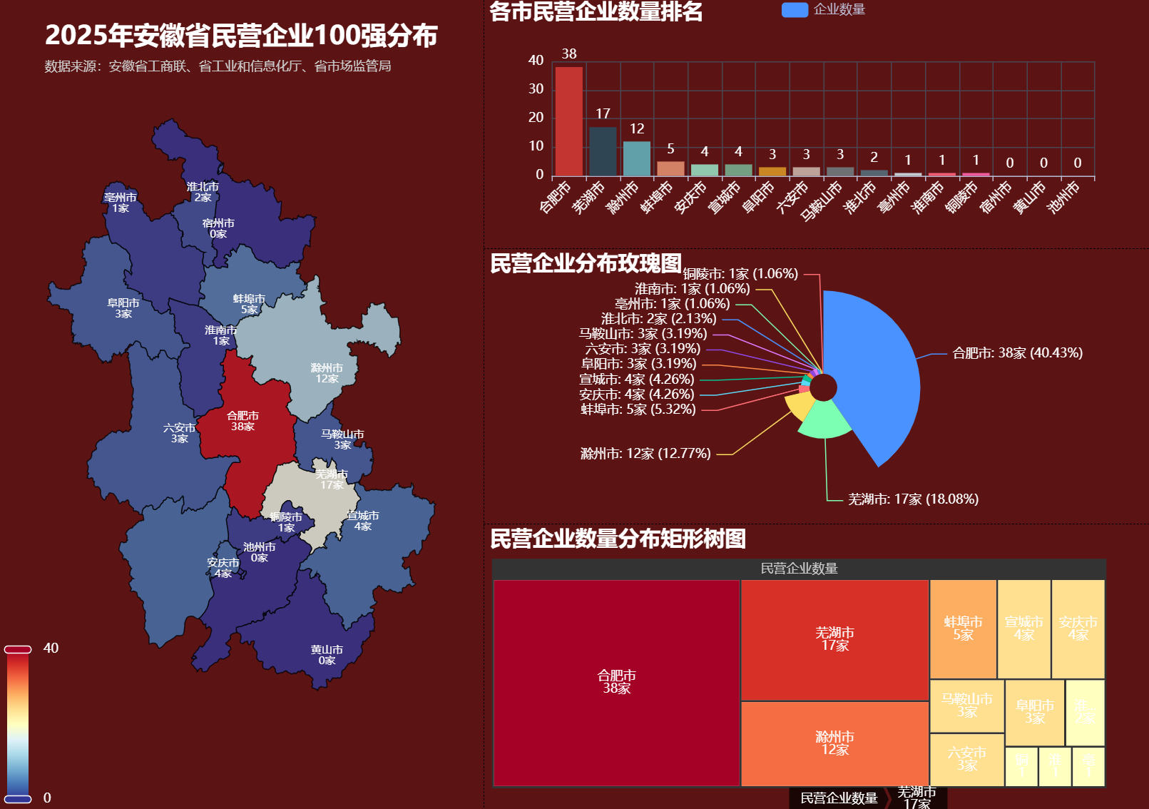 本文通过2D地图、柱状图、玫瑰图和矩形树图四种可视化方式,全面分析了安徽省民营企业100强的分布情况。这些图表从不同角度揭示了安徽省民营经济发展的区域特征和层级结构,为相关政策制定和商业决策提供了数据支持。