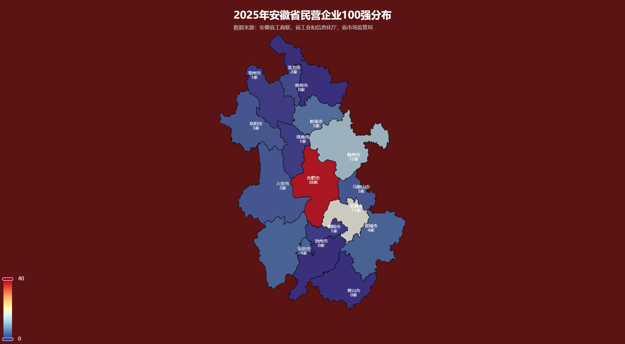 区域集中度高:合肥市以38家民营企业遥遥领先,占全省总数的38%,显示出极强的区域集中效应。