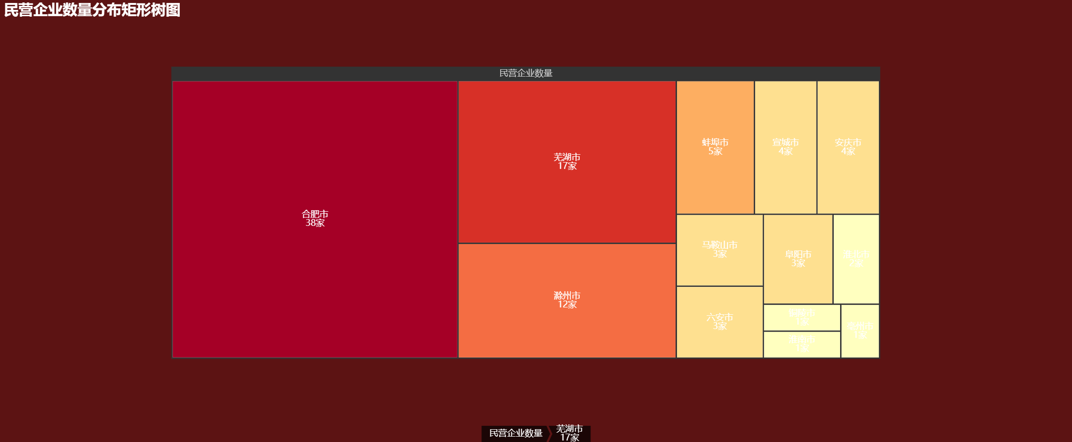 矩形树图(Treemap)通过面积大小直观展示各城市民营企业数量的占比关系: