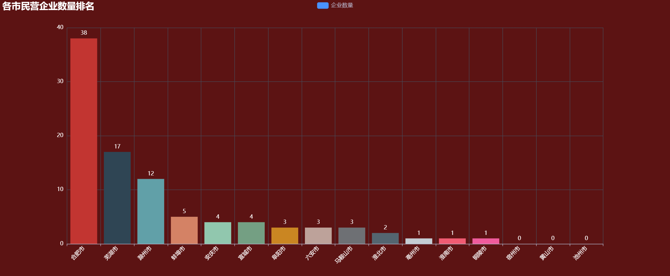 阶梯式分布:民营企业数量呈现明显的阶梯式分布,从合肥市的38家到芜湖市的17家,再到滁州市的12家,形成了三个明显的层级。