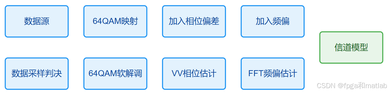 本文介绍了64QAM调制解调系统的关键技术,包括64QAM调制原理、软解调技术、频偏估计和相位同步模块。64QAM通过同时利用幅度和相位两个维度携带信息,实现高效数据传输。软解调采用概率判决方式,相比硬解调能显著降低误码率。系统采用FFT频偏估计和VV相位同步算法来补偿传输中的频偏和相偏,提高解调精度。文章还提供了MATLAB实现框架和仿真结果,完整程序可在CSDN下载,适用于matlab2022