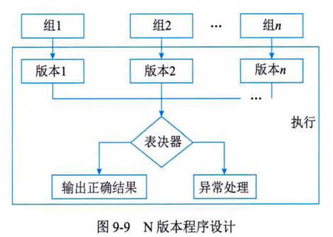 N 版本程序的设计思想是用 n 个具有相同功能的程序同时执行一项计算,结果通过多数表决来选择。其中 n 个版本的程序必须由不同的人(小组)独立设计,使用不同的方法、不同的设计语言、不同的开发环境和工具来实现,目的是减少 n 个版本的程序在表决点上相关错误的概率。