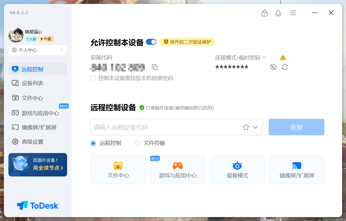 首先登场的是我们的 ToDesk!它是国内远近闻名的远程控制软件,在远程控制方面有着深厚的实力,凭借其高性能、高画质(支持2k 240 帧 / 1080p 360 帧高清画质)以及丰富的办公与安全(支持二次验证、安全认证等)功能,迅速霸榜各大远程控制软件榜单。截止目前,ToDesk用户支持数逐年递增,目前已超2.3亿人,备受用户喜爱。