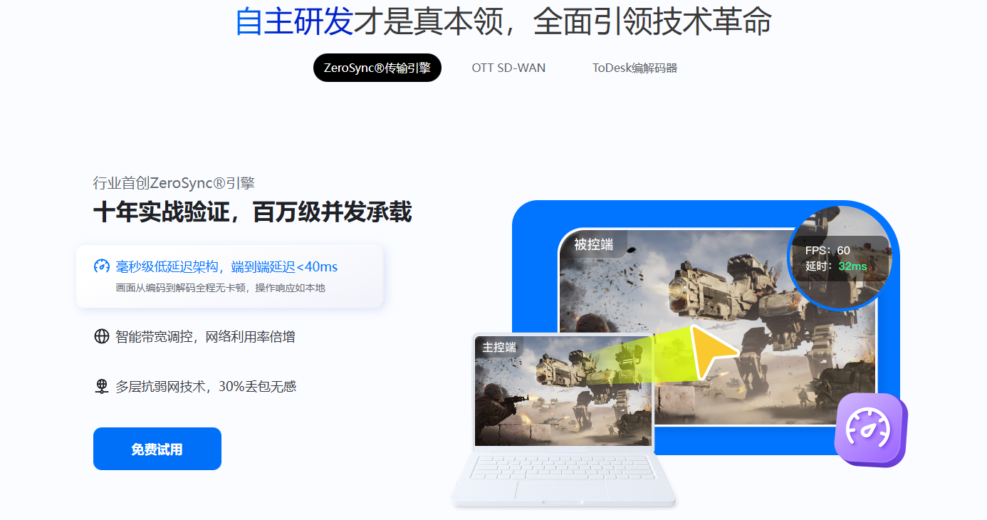 在远程控制技术研究领域,ToDesk首创ZeroSync®引擎、OTT SD-WAN 网络及音视频编解码技术。这些核心技术让远程控制实现低延迟、高画质的稳定传输,并通过智能网络导航选择最优路径规划,告别延迟卡顿问题。