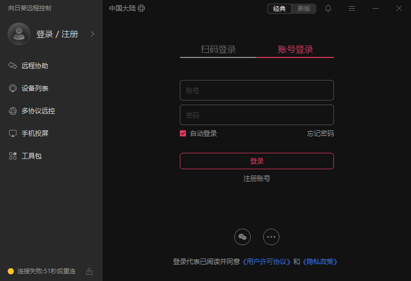 - 有新版和经典页面,提供扫码、账号以及免密登录。