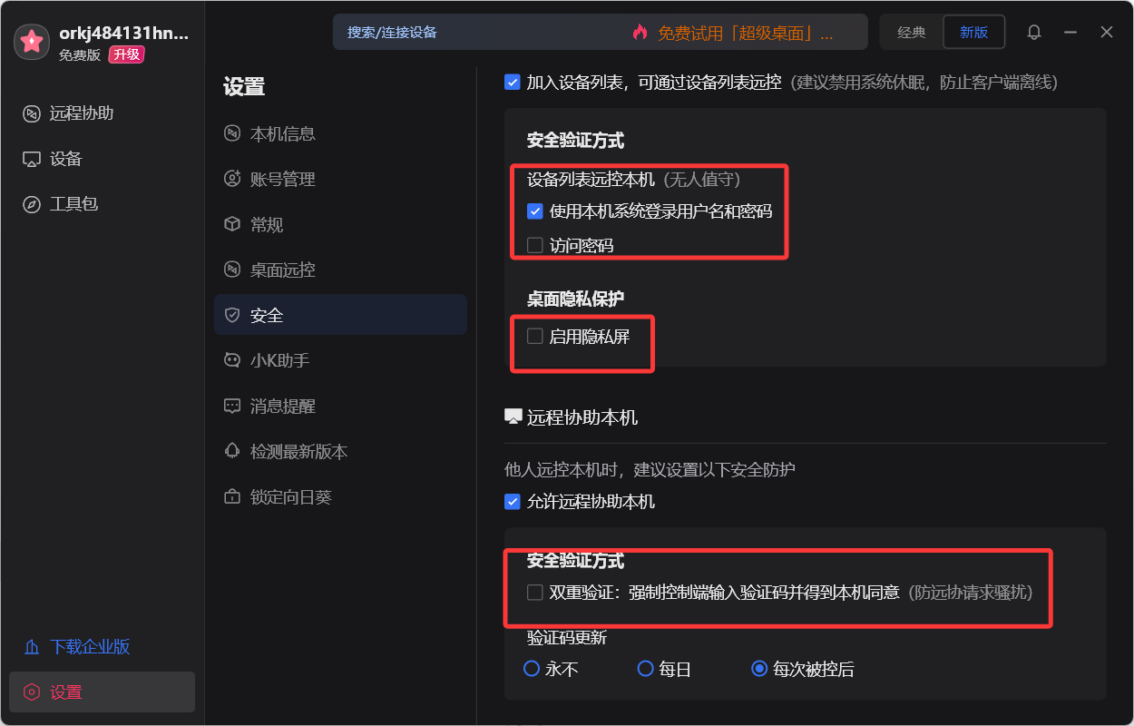 向日葵同样具备隐私屏,双重验证等,但是临时密码模块做得不如ToDesk,ToDesk的临时密码能提供更多选择。