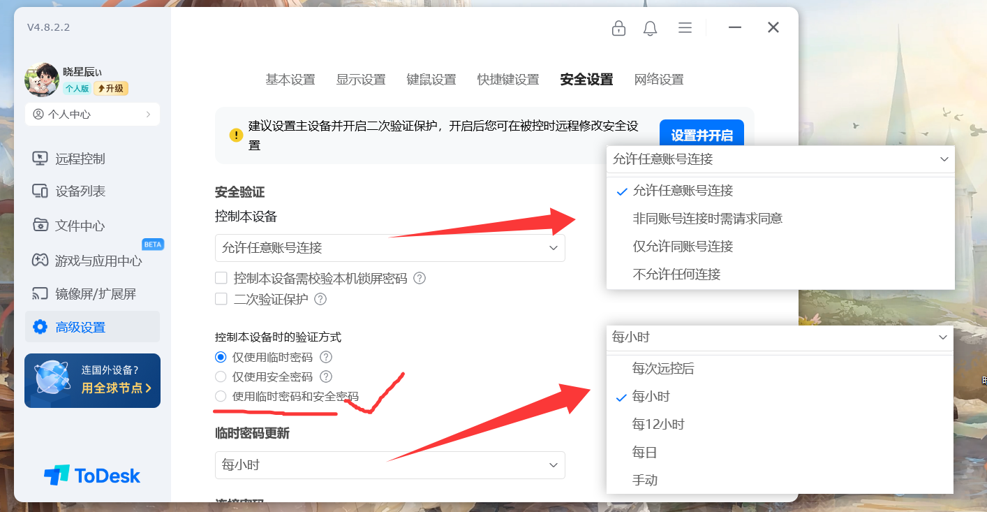 针对是否允许控制本设备,ToDesk 也提供了多种选择,如果不想让别人控制时,可以直接选择 “不允许任何连接”,就可以阻止其他人对的电脑操作。并且还可以设置临时密码的更新频率和选择安全密码来进行验证,进一步保证自己设备的安全性。