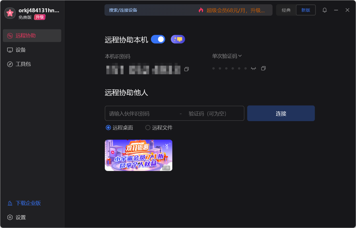 - 在界面设计上,向日葵新版的的主界面同ToDesk类似,但是在搜索栏和下方都加入了商业推广,并且我在首次登录账户时也推出的优惠购买,推广比较明显。