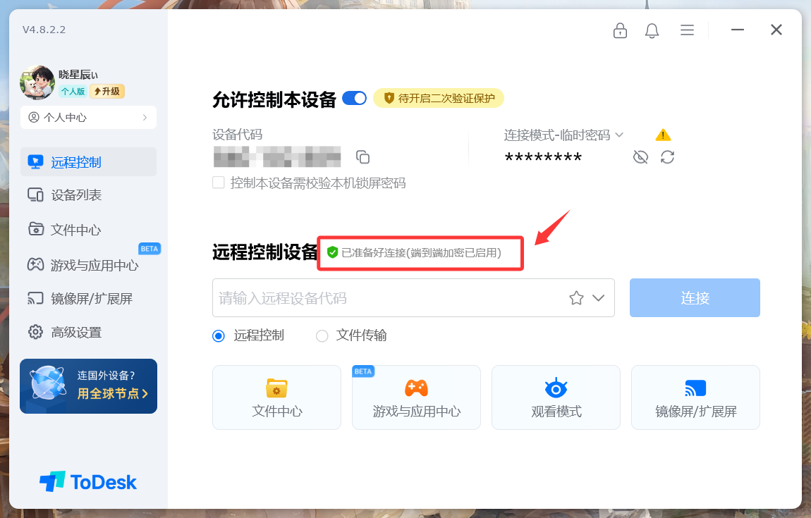 在安全性这方面ToDesk可以是其中的佼佼者了,可说是三款评测远程软件中 最安全的远控软件 ,其 “端到端加密” 的技术,意味着数据在发送端(控制端)就被加密,直到在接收端(被控端)才被解密,传输过程中任何中间服务器都无法窥探数据内容,有效防止了“中间人攻击”。