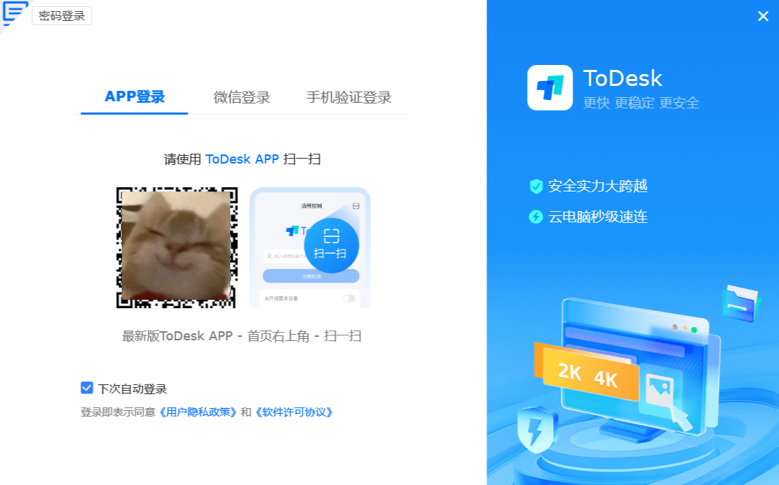 - 在安装完成之后,登录账户后,就可以开启ToDesk软件。从下图我们可以看到,ToDesk提供了5种登录方式:APP、微信、手机验证码、密码或邮箱,哪个方便选哪个。