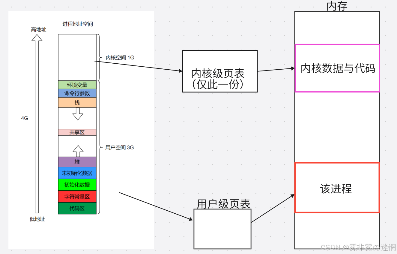 如果有50个完全不同进程,那么可能有50个页表,对应50个该进程在内存的分布空间,而我们可以看到上面有1G的内核空间,那对应50个内核代码和数据吗?内核空间也有自己的内核级页表