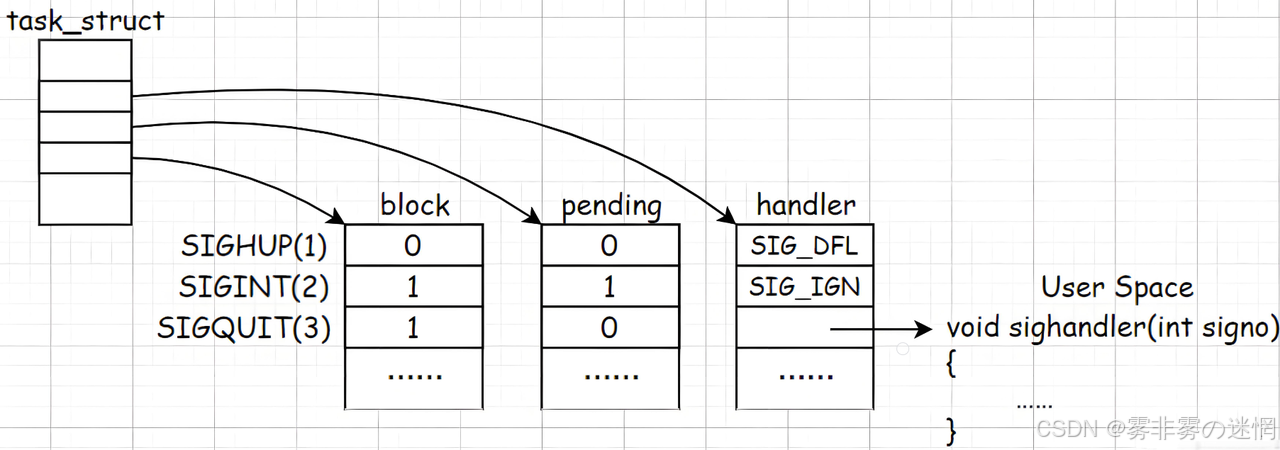 作用:sigprocmask 直接修改进程 task_struct 中的 block 集合,从而控制信号的 “阻塞状态”