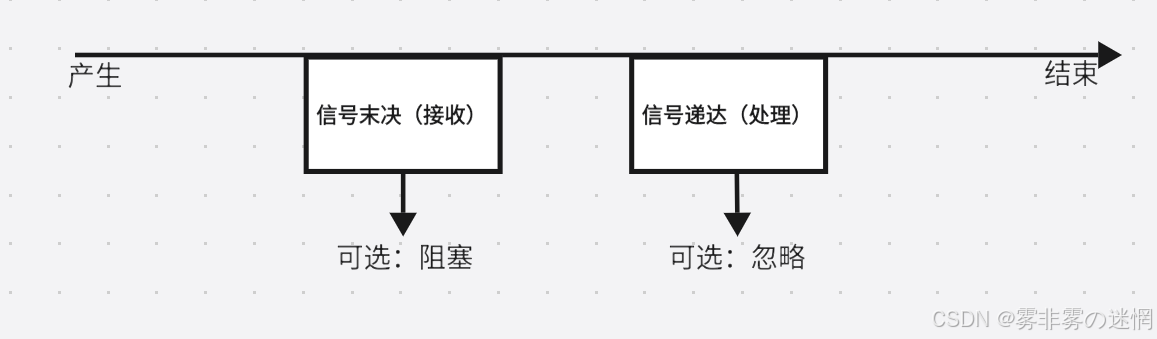 信号阻塞:进程可以选择阻塞某个信号,阻塞的信号会保持在末决状态(产生但是不执行),只 有解决对该信号的阻塞,才会执行递达