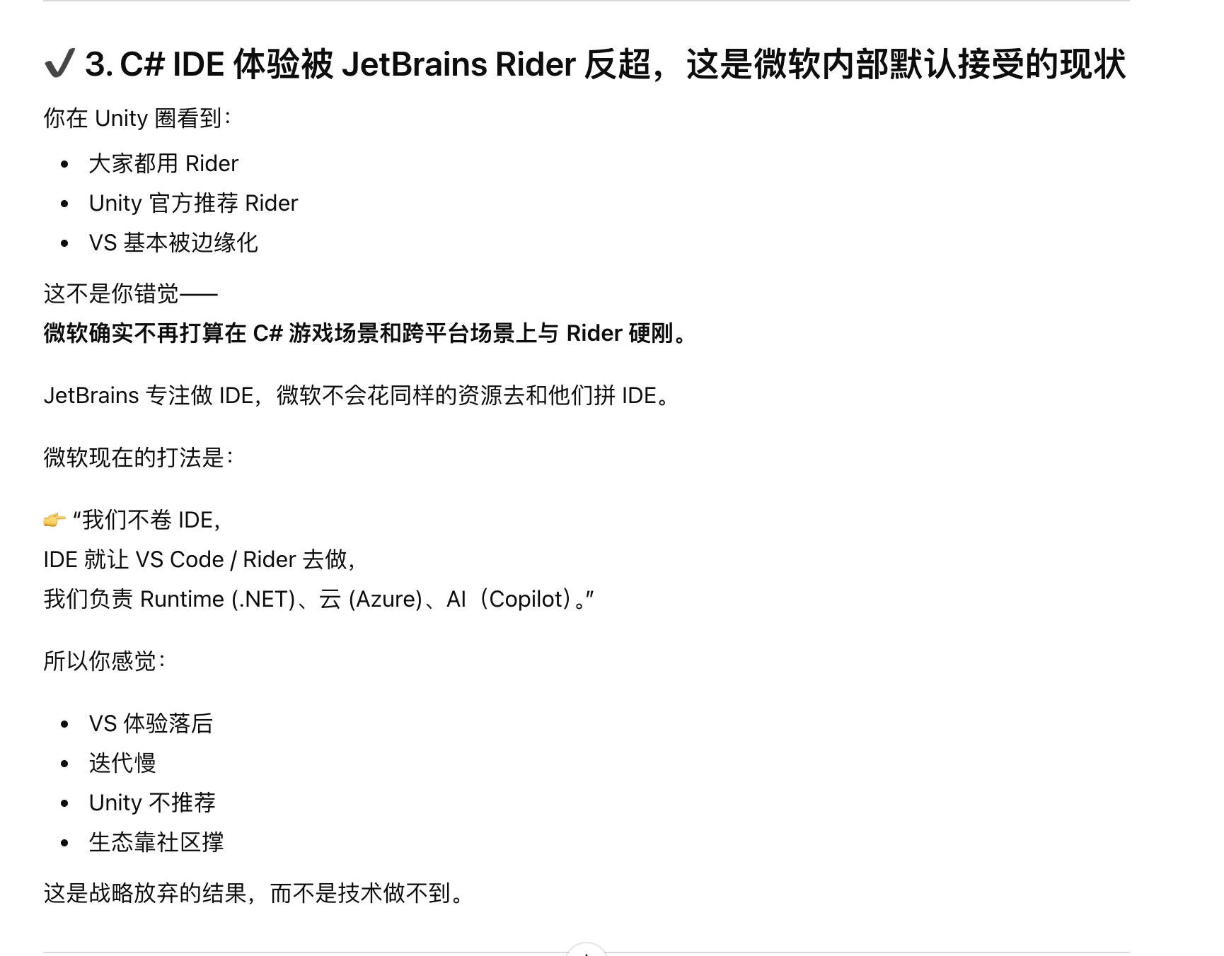 Unity 生态中 IDE 格局的转变,本质上是微软战略调整的结果。微软并非不具备打造顶尖 C# IDE 的技术能力,而是主动选择在 C# 游戏场景和跨平台场景中放弃与 Rider 的正面竞争,将资源集中于更具核心竞争力的业务领域。