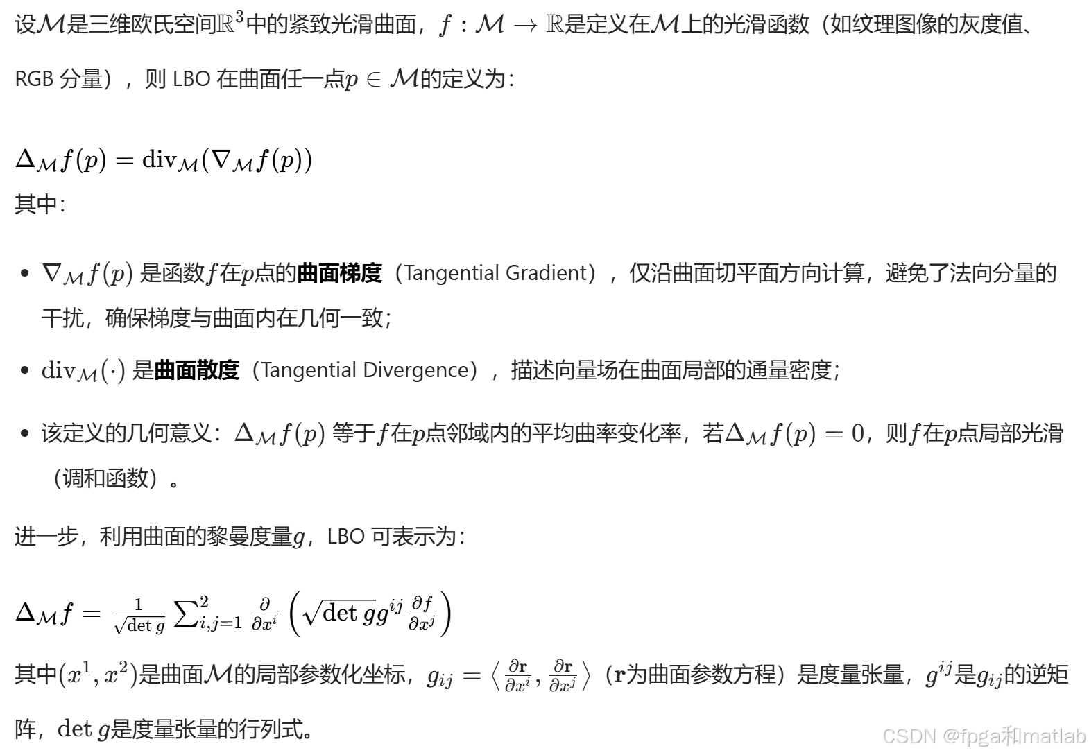 拉普拉斯-贝尔特拉米算子是微分几何中定义在黎曼流形(如三维人脸曲面)上的二阶微分算子,是平面拉普拉斯算子在弯曲曲面的自然推广,记为ΔM。其核心作用是描述流形上函数的“曲率”——即函数在某点的局部平均变化率,反映函数在曲面局部的光滑程度。