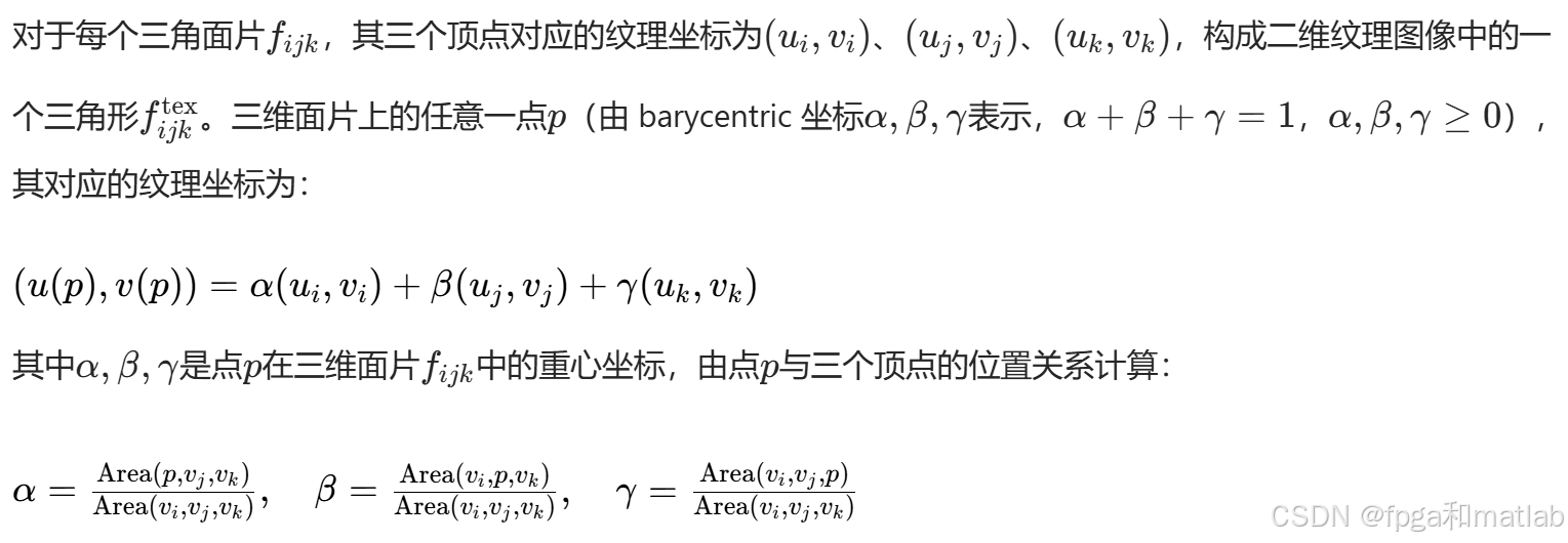 得到所有顶点的纹理坐标后,需将二维纹理图像的像素信息映射到三维网格的三角面片上,核心是解决“面片内部像素的纹理值插值”问题。