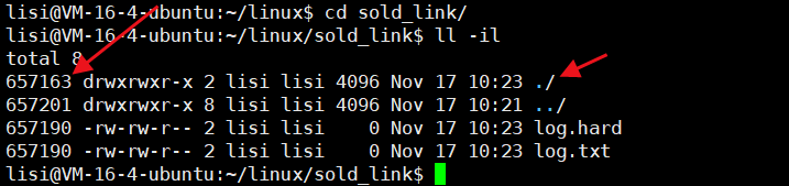 答:我们可以发现当我们进入到这个目录之后,. 这个文件名的 inode 编号和当前目录编号是一样的。而 .. 表示上级目录: