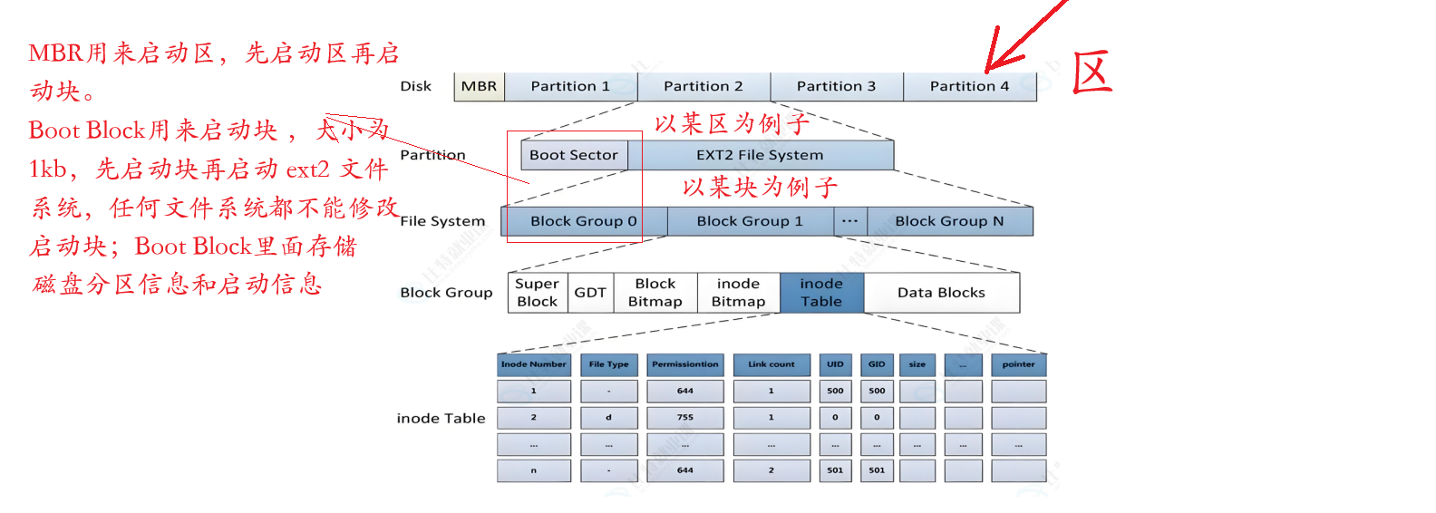 Inode tabe 里面存储的是多个文件的属性,Data Block 存储的是多个文件的内容。 Block bitmap 记录Data Block 的使用情况,他是一个位图操作;inode bitmap 里面记录是文件属性有多少个,也是位图操作。GDT是记录整个块组的信息。Super Block 存放⽂件系统本⾝的结构信息,描述整个分区的⽂件系统信息。记录的信息主要有:bolck 和 inode的 总量,未使⽤的block和inode的数量,⼀个block和inode的⼤⼩,最近⼀次挂载的时间,最近⼀次写⼊数据的时间,最近⼀次检验磁盘的时间等其他⽂件系统的相关信息。Super Block的信息被破坏,可 以说整个⽂件系统结构就被破坏了;Super Block不是每个块组都有,只有2——3个之间,2—3个是为了备份Super Block ,防止 Super Block 的丢失。