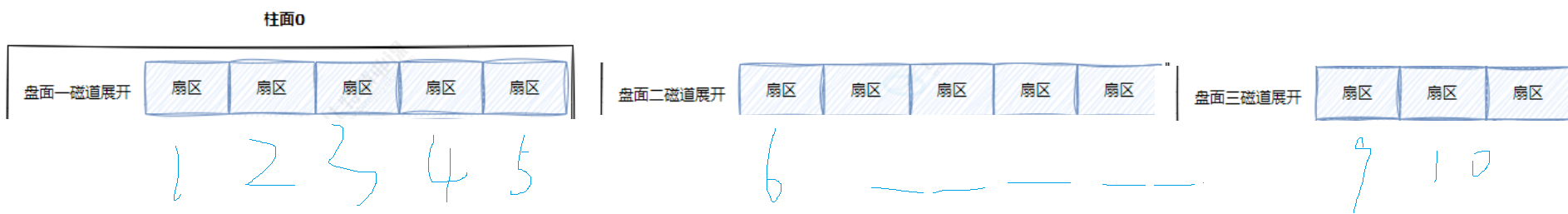 因为这个磁盘是由多个柱面构成的,所以后面的柱面是接着前一个柱面的一维数组的,下标是连续的。