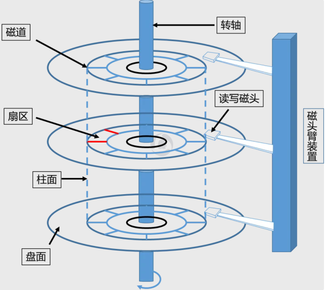 圆形的磁盘上面有个磁头,这个磁头在磁盘的上面,他们是不挨着的,因为如果挨着就会高速摩擦生热,此时这个磁盘就报废了;所以我们多年前使用的电脑如果不小心摔了,就会导致磁头震荡,一不小心就会与磁盘接触,导致磁盘高温消磁。