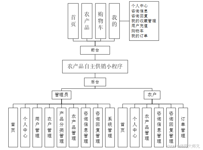 本文介绍了一个基于SpringBoot+Vue的农产品销售系统设计与实现。该系统分为小程序端和后台管理模块,包含用户、农户和管理员三种角色。小程序端提供农产品浏览、购物车、订单等功能;后台支持用户管理、农产品管理、订单处理等操作。系统采用Java编程语言和MySQL数据库实现,具有农产品展示、在线交易、咨询互动等功能模块。文章详细阐述了系统架构设计、功能模块实现、数据库表结构以及核心代码示例,为农