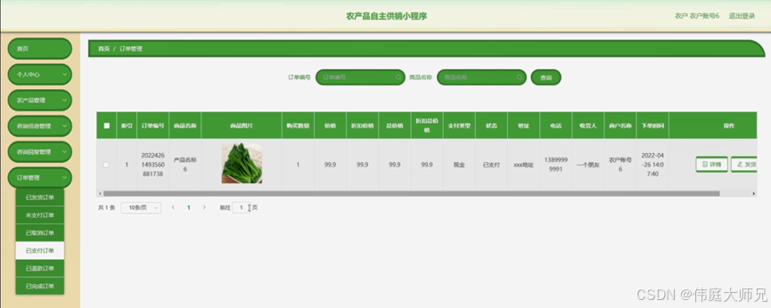 农户登陆系统后,可以对首页、个人中心、农产品管理、咨询信息管理、咨询回复管理、订单管理等功能进行相应操作,如图5-16所示。
