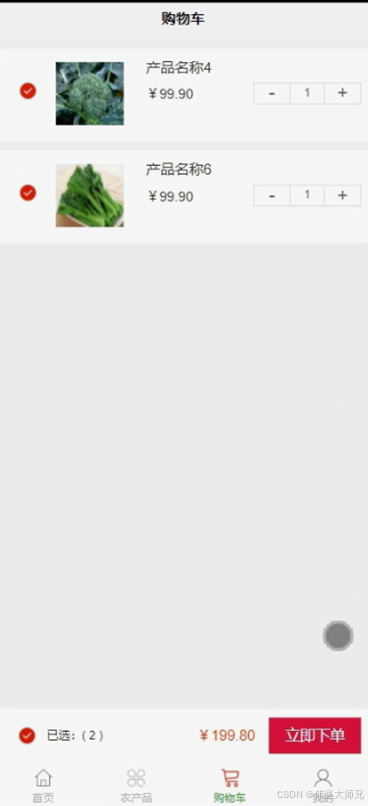 用户登陆小程序端,可以对首页、农产品、购物车、我的等功能进行详细操作,如图5-3所示。