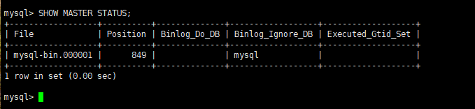 在上图中,请记录下返回结果中的 File (例如 mysql-bin.000001) 和 Position (例如 849) 的值,下一步配置从库时会用到。
