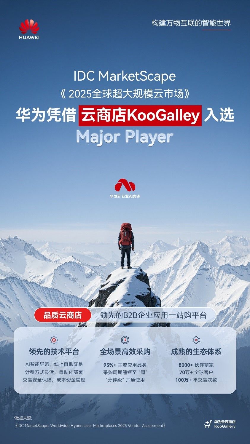 近日,全球领先的IT市场研究和咨询公司IDC发布《IDC MarketScape: Hyperscaler Marketplaces 2025 Vendor Assessment》(2025 年全球超大规模云市场供应商评估),华为凭借云商店KooGallery入选“Major Players”阵营。