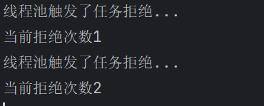 测试没有问题,最大线程数加上阻塞队列长度为5,拒绝3次,所以说刚好是两次拒绝。