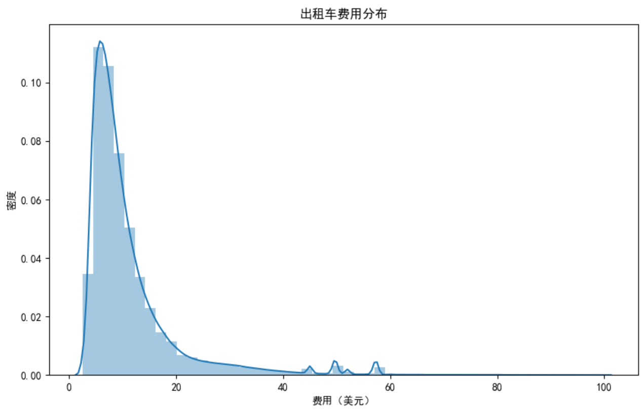 发现:费用呈现右偏分布,大多数行程费用在20美元以内。