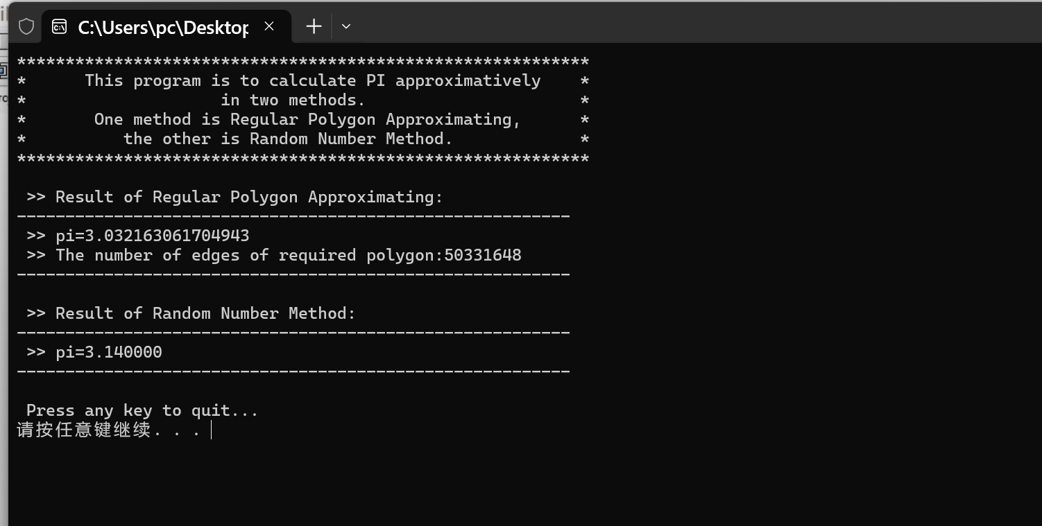 数学无处不在,让我们一起体会数学的魅力。本文将通过一串代码来展现圆周率π的近似计算,介绍两种典型的计算方法:正多边形逼近法与随机数蒙特卡洛法。为了让人们更加了解π的近似计算,本文将从代码的核心逻辑分析开始,逐一拆解两种方法的实现思路,并呈现编译过程中遇到的问题及解决方法,进而展现最终运行成功的结果。希望这篇文章可以让每一个热爱数学的人对π的近似计算有更清晰的认识。