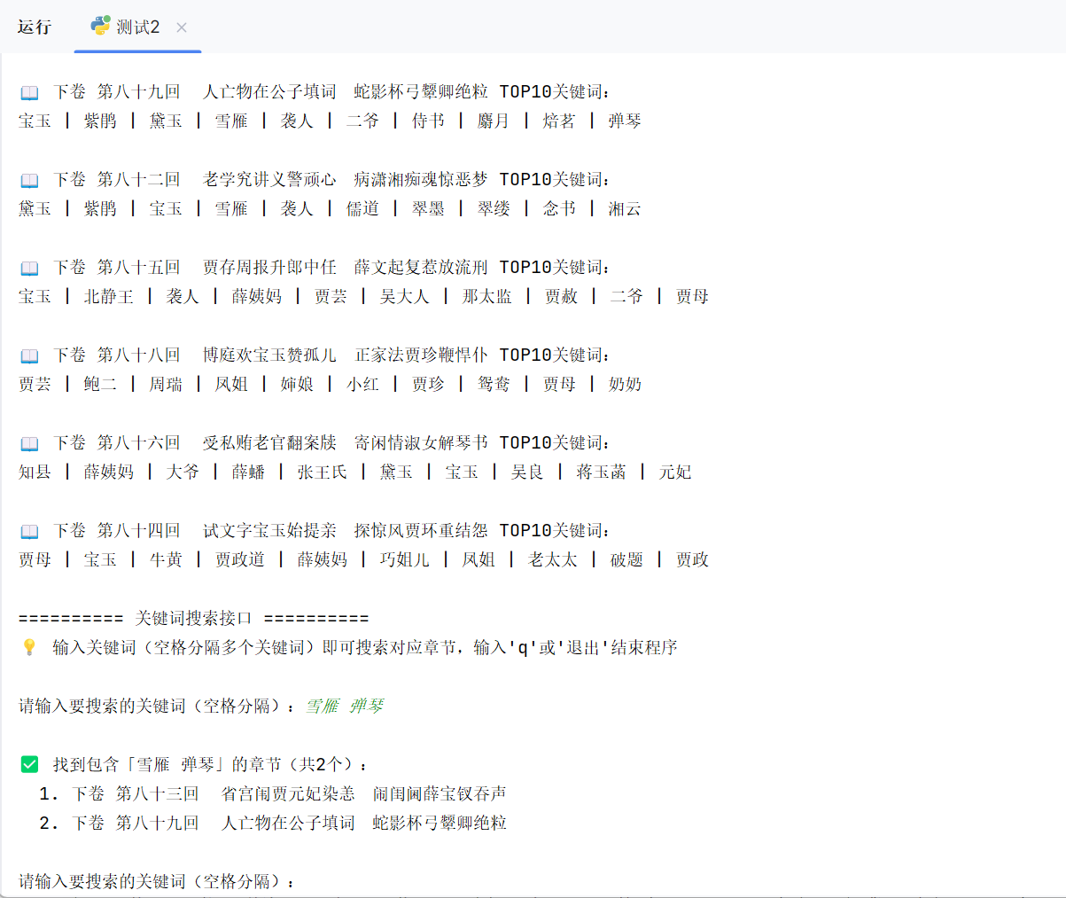 结果存储:用字典存储章节名与关键词的映射,便于后续查看和复用。