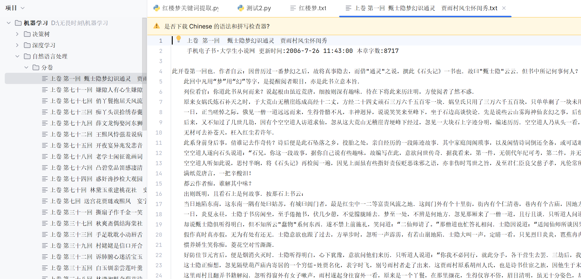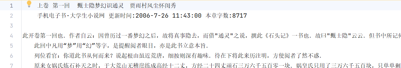 文本预处理:将《红楼梦》全文按“卷 第”拆分,生成单章节文本文件;