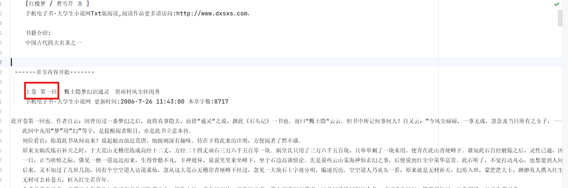 观察红楼梦文本数据,发现每一回的结构都有“卷 第”的格式: