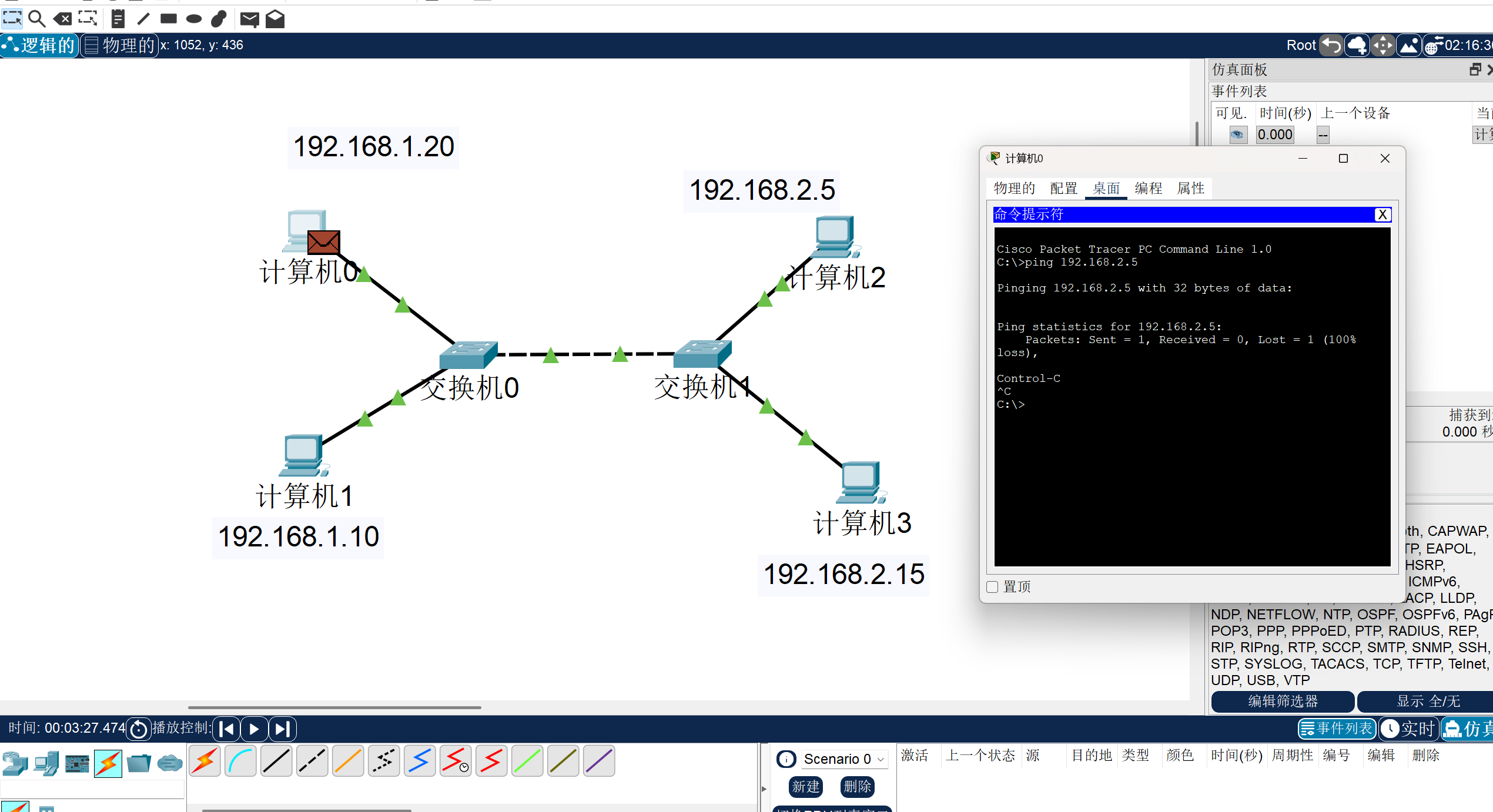 ● 之前的多台计算机互联,连接的设备必须在同一网段,处在同一广播域,像下图中的计算机0去ping计算机2是ping不通的,那这个时候,我们路由器就来了。