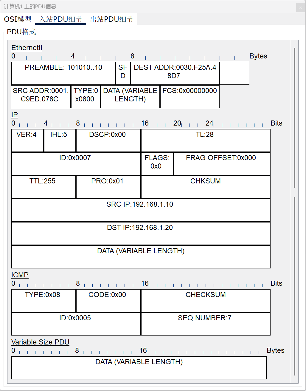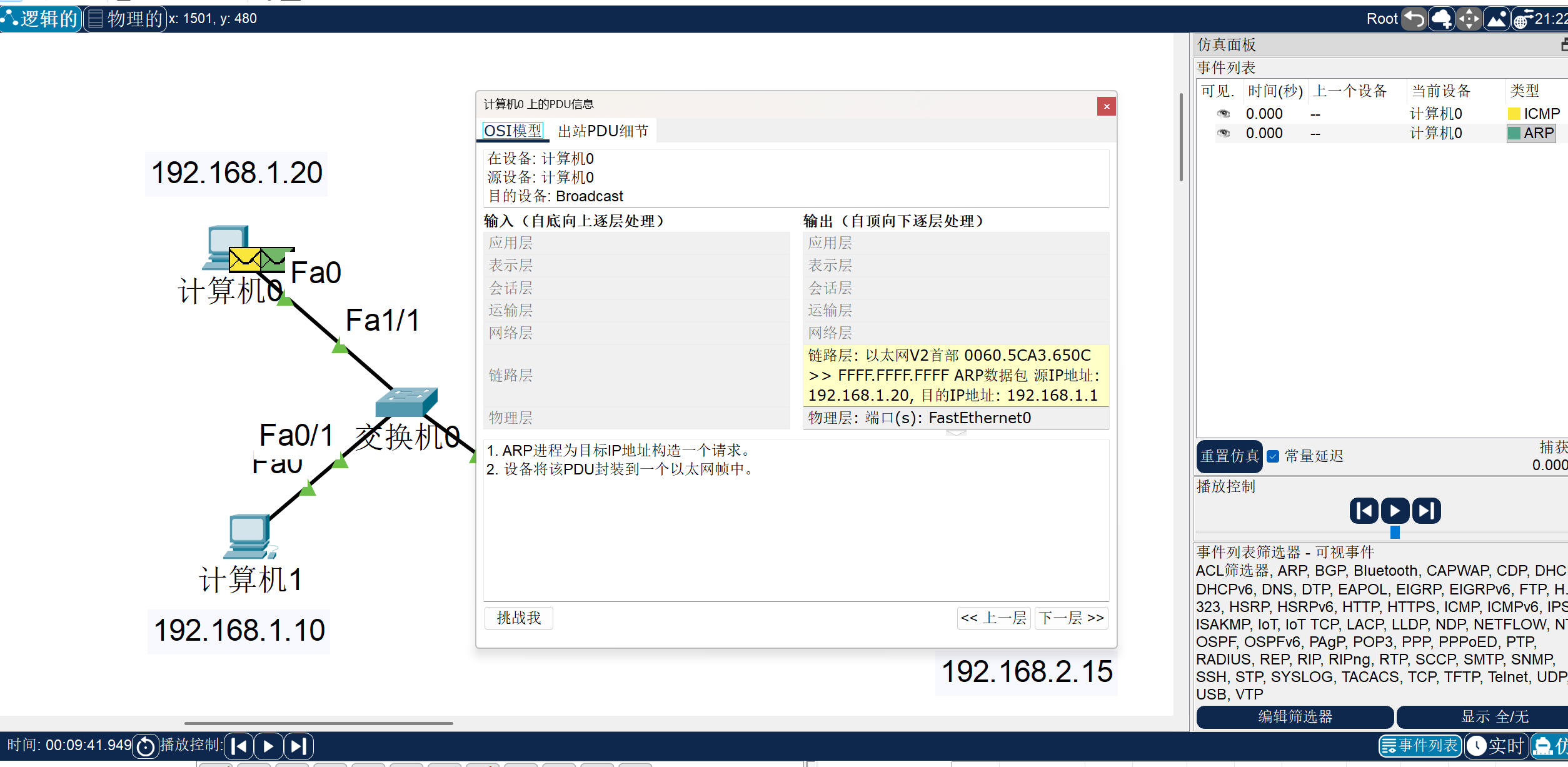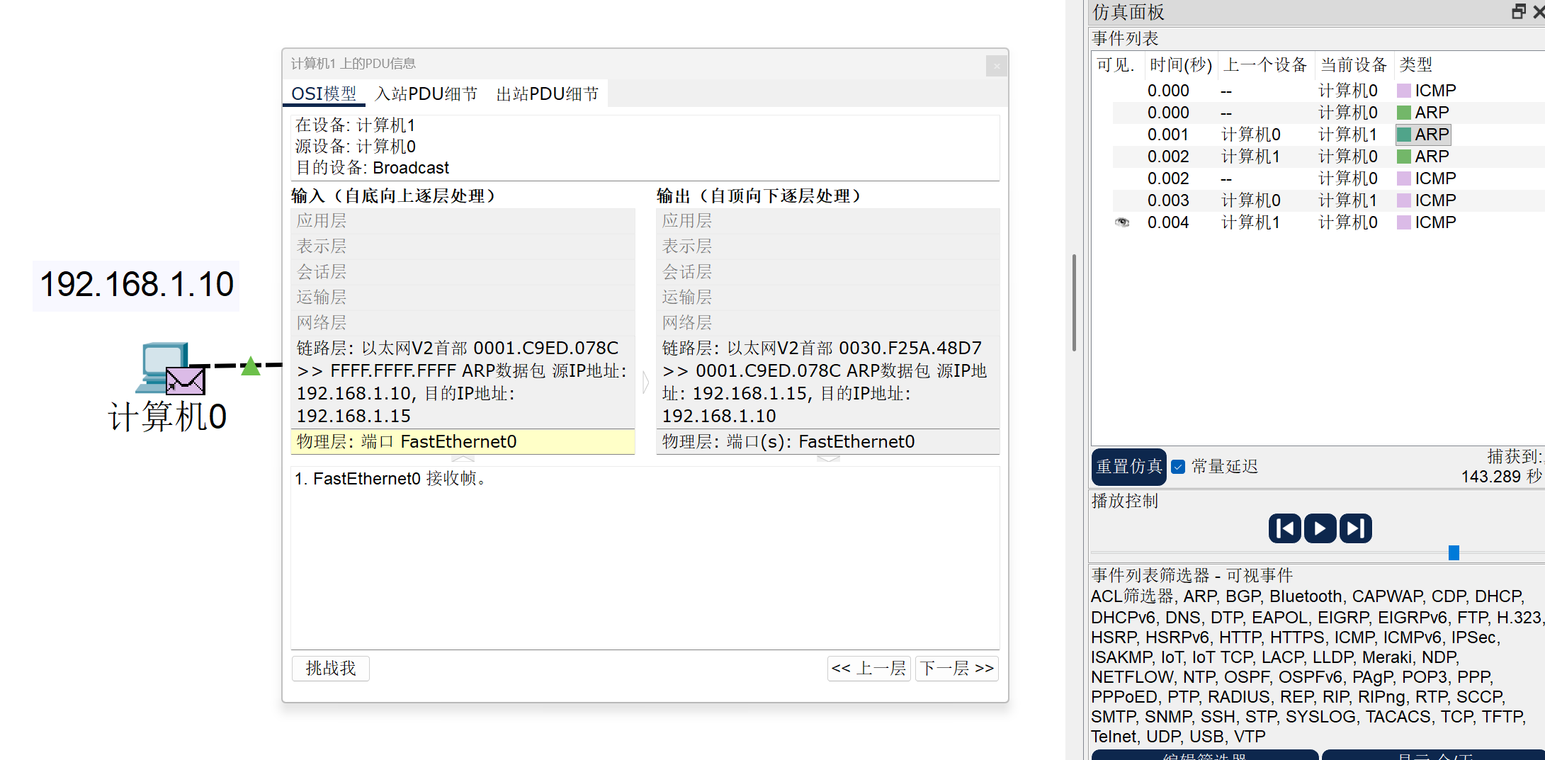 我们可以看到,我们此处从计算机0发往计算机1的ARP包中就写了,从哪哪哪也就是第一条MAC地址,发往FFFF.FFFF.FFFF的设备(这个全F的地址含义是广播,也就是只要现在跟我连着的设备,我全都发),该目的设备拿了包一看,如果IP地址对上了:“我去,这老乡见老乡,两眼泪汪汪,原来你才是我的命中注定之机”,那么该设备就会向源设备回一个ARP包,其中就会包着该设备的MAC地址。若并非是自己的IP地址,那就不用回了。