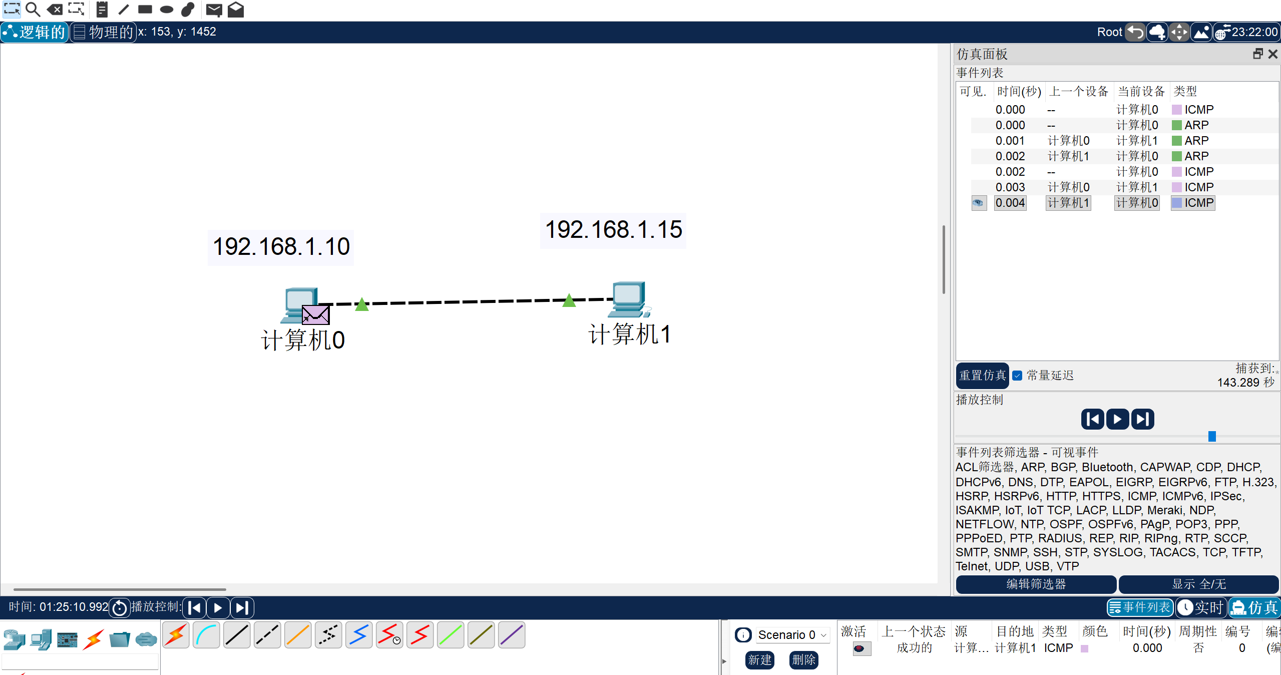 我们的红框就是我们的ping命令了,我们点击一下,并点击你想发送的起始PC,再点击另一台PC就可以了,而我们的蓝框就是将这个操作给拆分,并一步步执行。而我们的绿框,则是对上述ping命令的删除,也就是会删除右上角的框框中的内容。