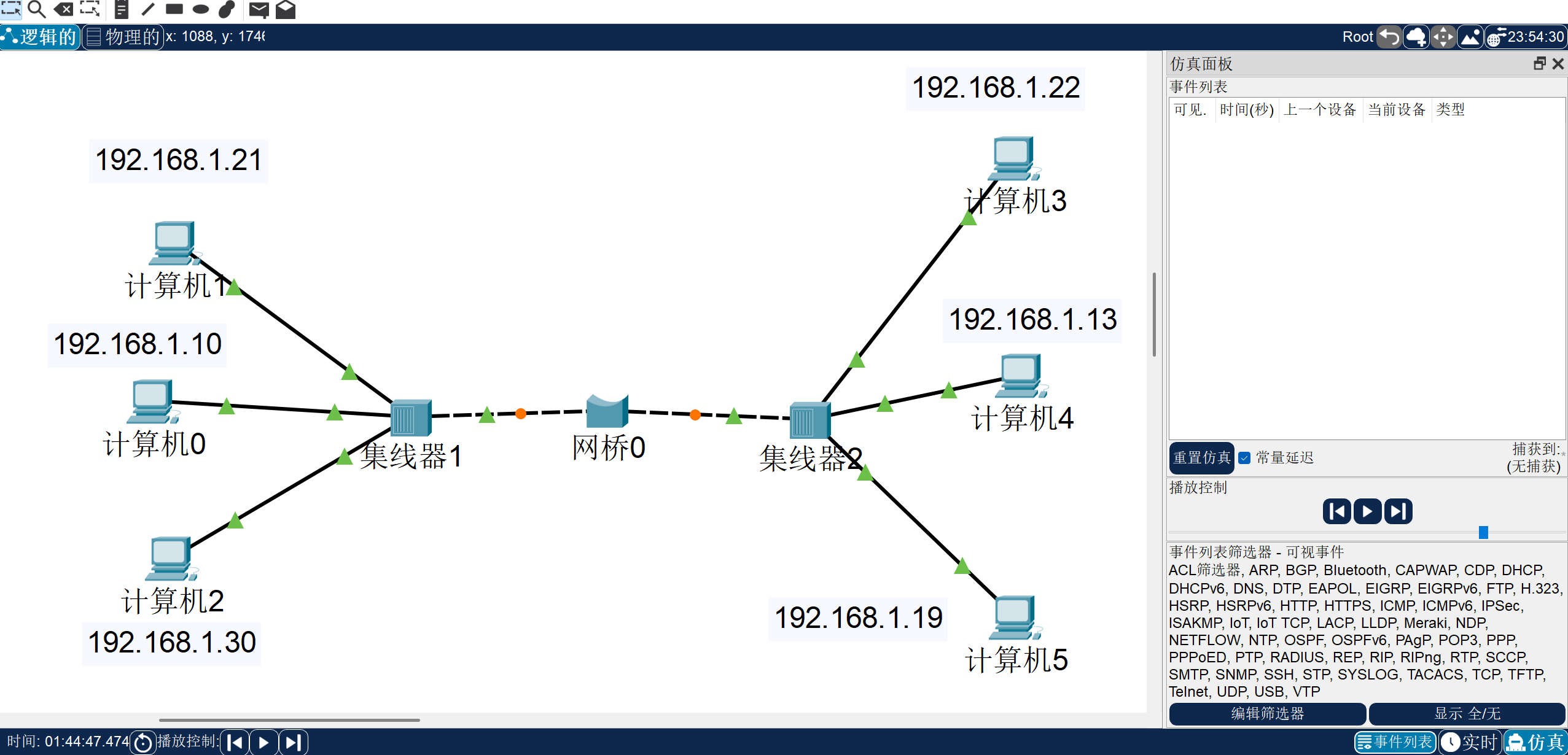 (如果此处网桥左右两边的绿色三角变成橙色了,那么不断切换实时和仿真模式就可以变为绿色三角,相当于是个bug?)