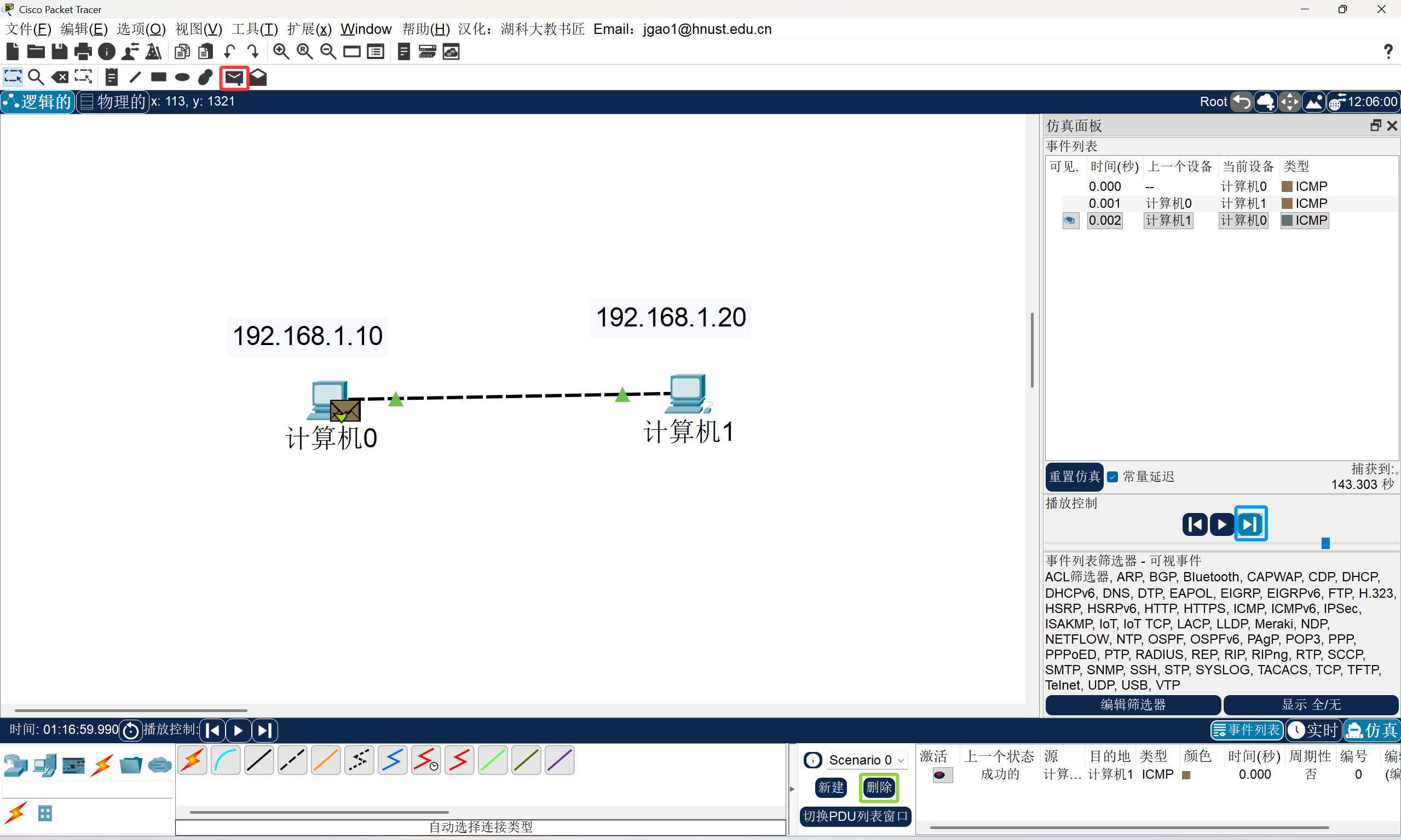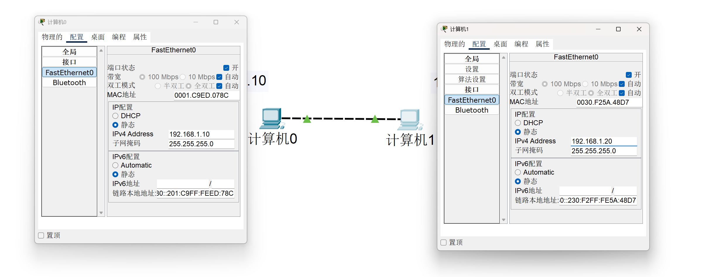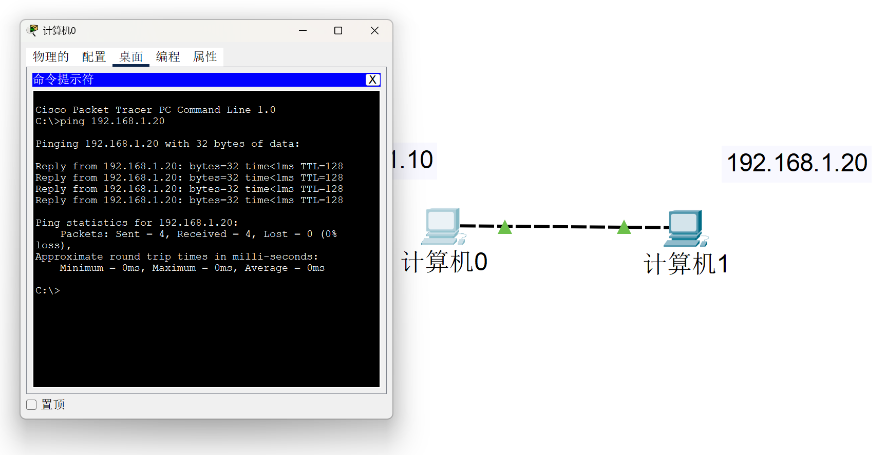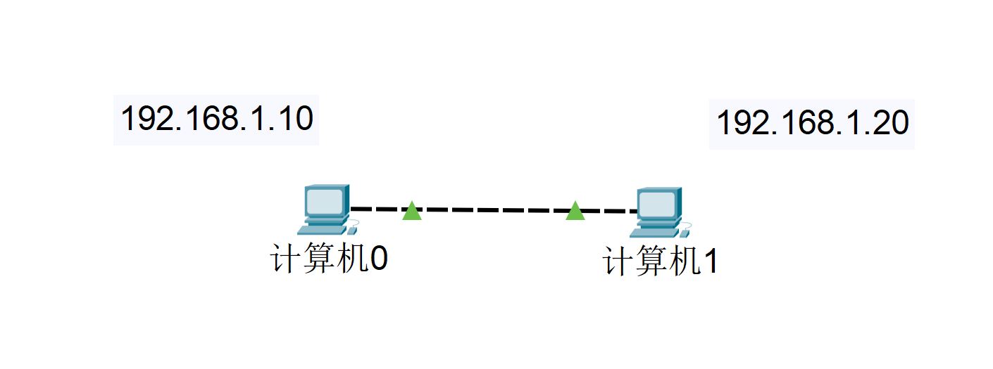 像这样,我们就完成了对两台PC设备之间的连接,此时,我们需要ping命令来验证我们的连接。