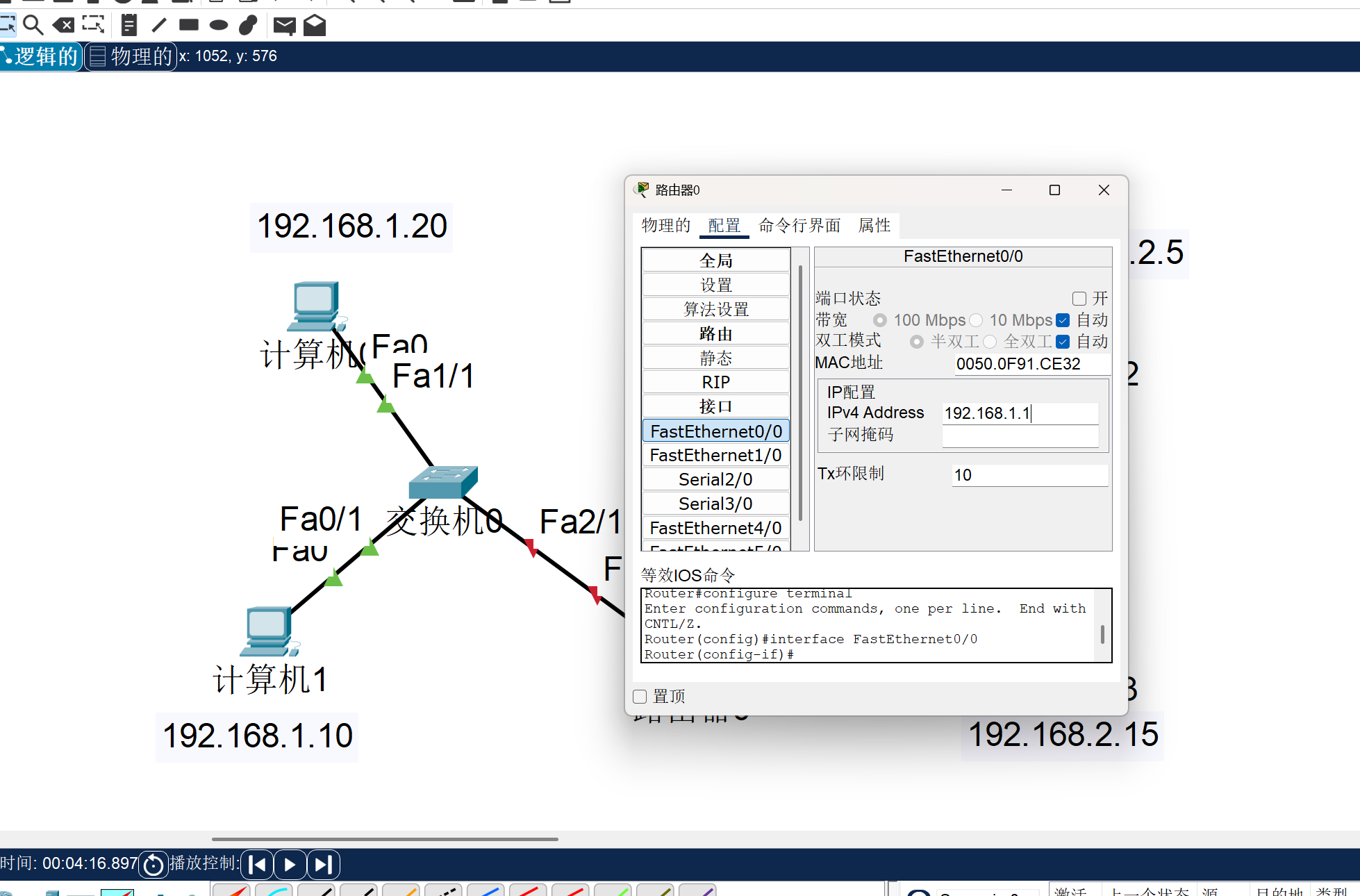 我们按照上方图片中注释里的IP来配置,填在在FastEthernet0中的IPv4 Address栏,填上上图的IP,我们的子网掩码会自动配置好,至于为什么这么配,仍会放在我们的IP章节。