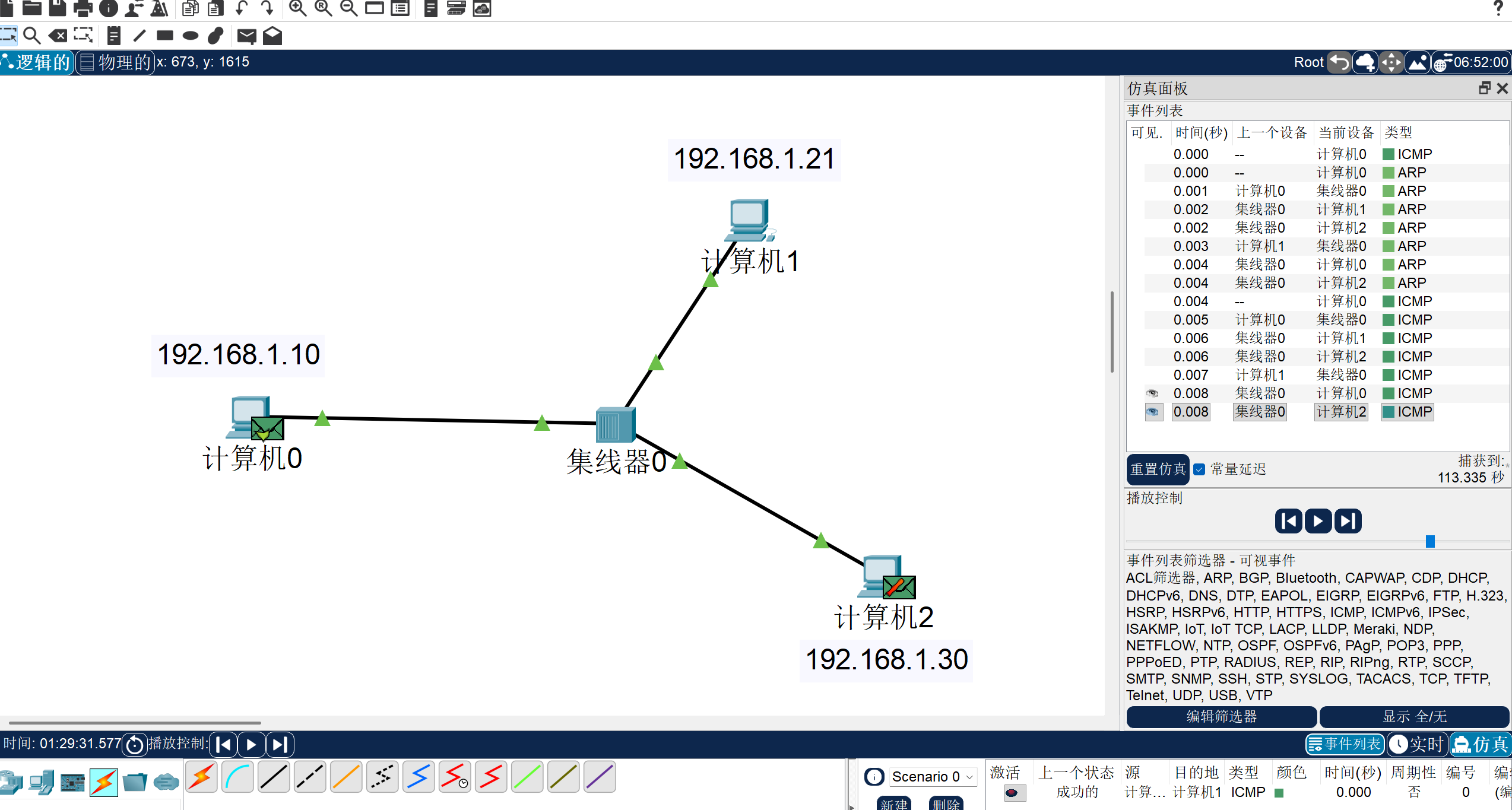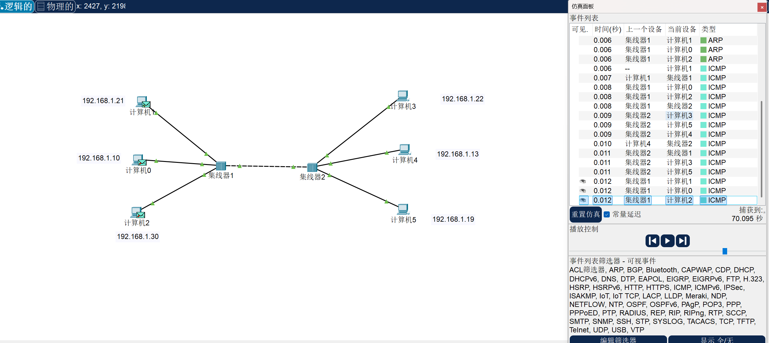 看到右边的栏目我们会发现,每次消息发送到集线器时,集线器都会广播一次,这是因为集线器是没有记忆能力的,只是一台纯硬件。等会我们看到交换机就不一样了。