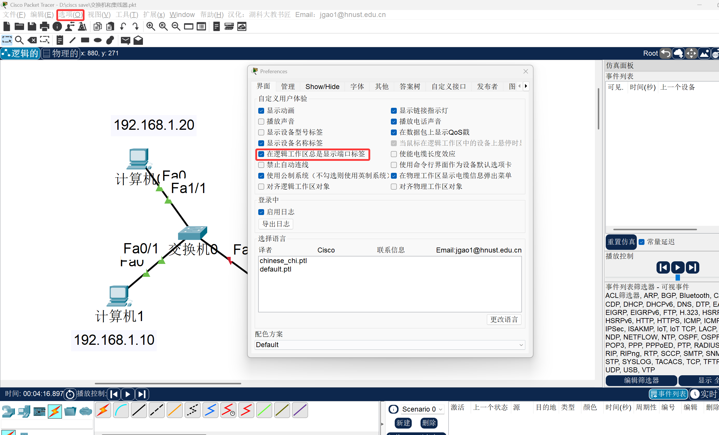 我们再点开我们的路由器配置来看,我们会发现好多的接口啊,那这个路由器的左边和右边的线到底又分别对应哪个接口呢,我们设置里就可以设置显示出来这个线条的对应接口,点开我们最上面的选项,再点首选项,再点击红框中的选选项就会出来了