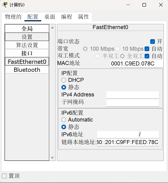 我们单击我们的PC设备,我们会发现,我们进入了“计算机的内部”,在这里我们要配置我们的IP地址,在配置选项中的FastEthernet0,你可以把这个东西理解为我们的网卡。