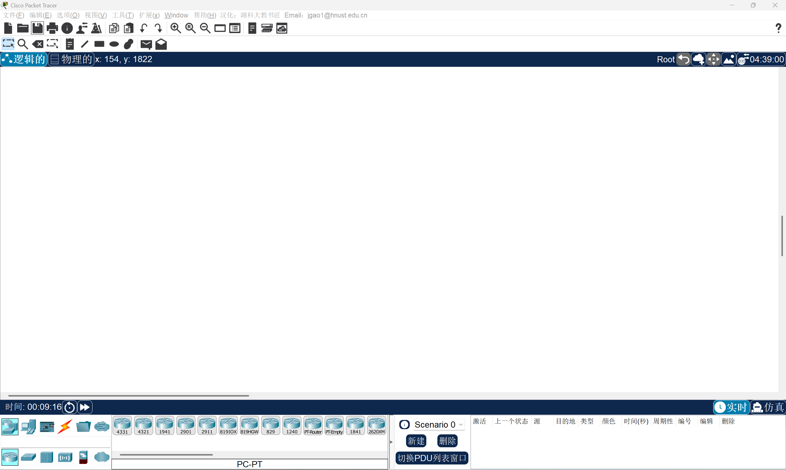 在根据流程成功进入Cisco Packet Tracer后,我们会发现我们界面是形如这样的