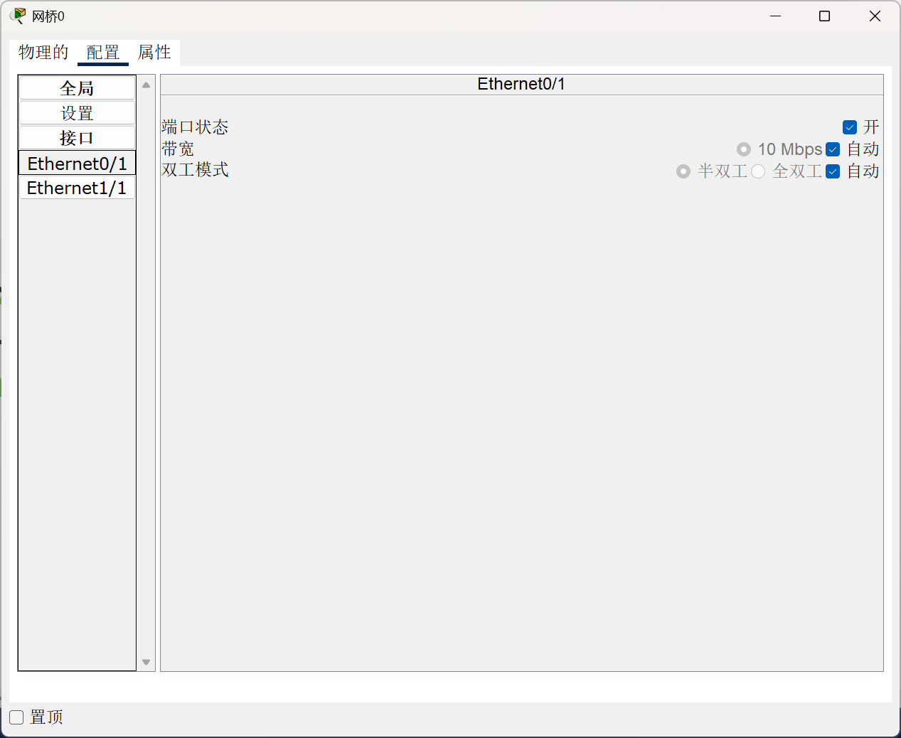 网桥设备在我们软件中交换机栏那里,我们将它拿出来后,我们点击它,我们发现网桥这个东西,它并不用配置什么IP什么的,也就是说它仍然是物理层的硬件,不过是加了张“记忆存储表”的集线器。