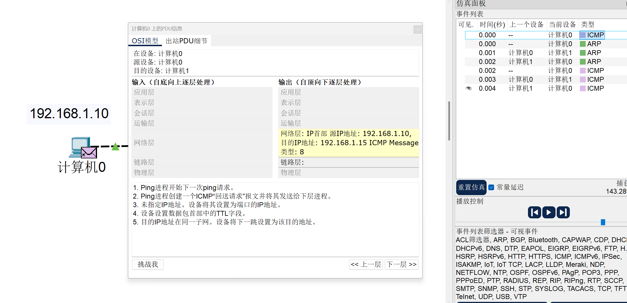 找到过后当ARP回到了计算机0且计算机0发了ICMP包到路由器那,我们会发现,路由器会继承原本计算机0的工作,即去广播谁是计算机2,且我们会发现我们的路由器会将ICMP包给丢掉,因为路由器在广播的过程中,路由器的等待队列会将第一个ICMP包丢掉,并等待足够的时间让计算机0重发这个包,然后再去发给计算机2,这部分原因是考虑到,因为如果对面没有想要的IP地址,但ICMP包仍占据了路由器的等待队列,这样肯定会占据不必要的资源,故进行了丢包。